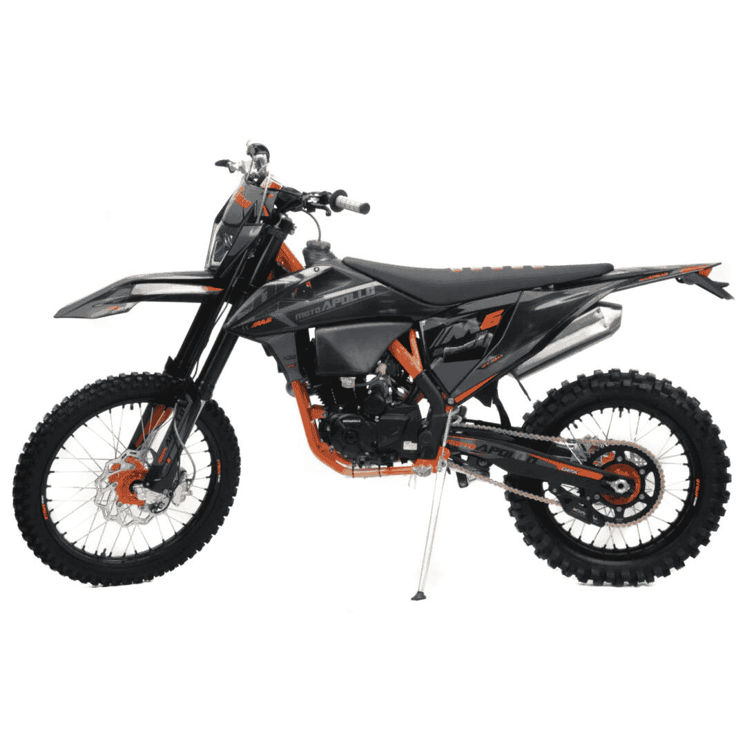 Мотоцикл Кросс Moto Apollo M6 300 весит 120 кг, выдерживает нагрузку до 150 кг. Прочный облицовочный пластик не ломается при сгибании, защищает от грязи. Надёжно закрепленный руль имеет