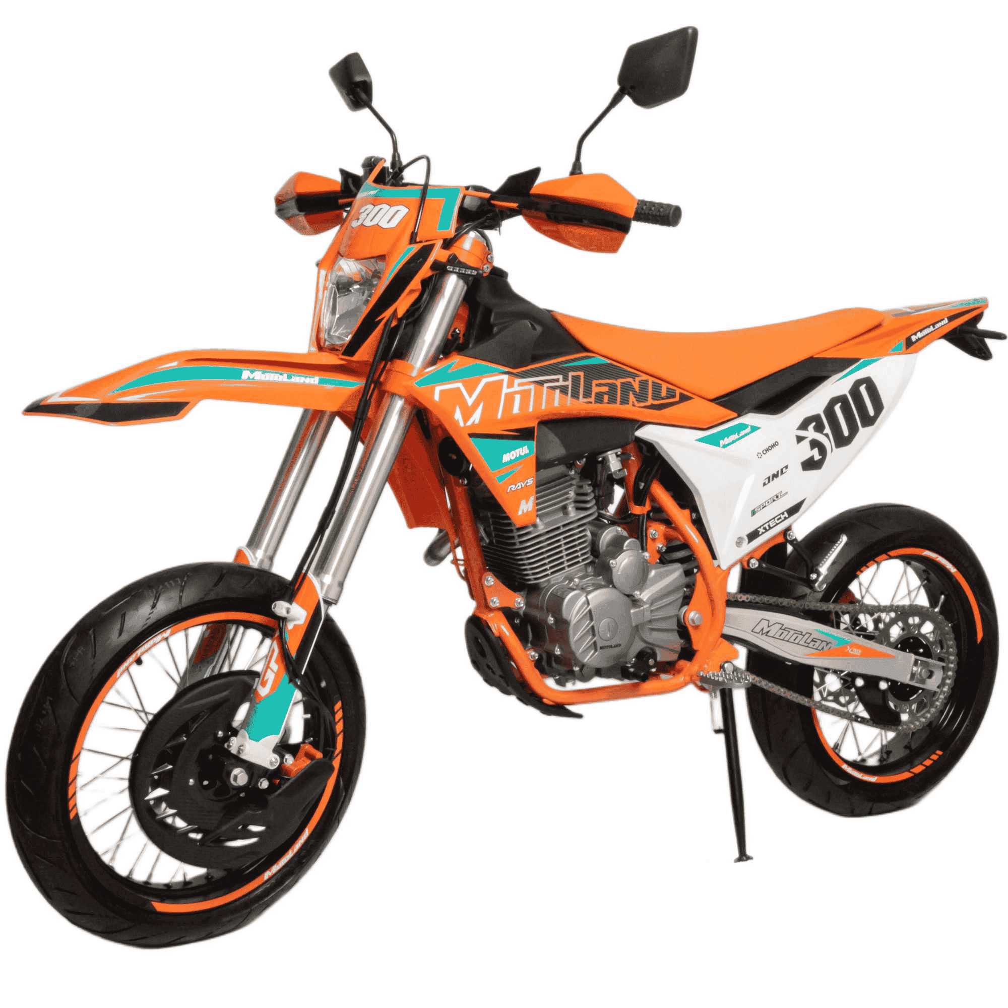 Мотоцикл Кросс SMX300 (мотард) выдерживает нагрузку до 150 кг. Прочный облицовочный пластик типа КТМ 2024 года. Надёжно закрепленный руль имеет переменное сечение: 28 мм в месте крепления и 22 мм на концах под грипсами, а также короткоходную ручку газа. На мотоцикле установлена защита рук и подножки для пассажира. Колёса алюминиевые, оснащены усиленными спицами и антибуксаторами, размер задне