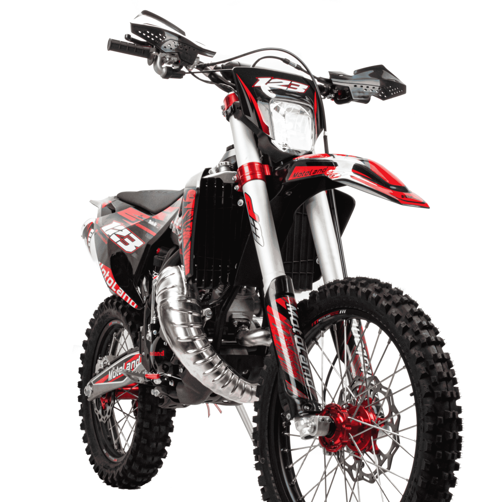 Топовый мотоцикл выглядит соответствующе — стильно и солидно. Без лишнего пафоса, но с уверенностью в собственном превосходстве над аналогами. Как и другие модели Motoland покрыт комбинированным пластиком, который не ломается при сгибании. Все стыки идеально подогнаны, наклейки ровные. Кроссовый мотоцикл доступен в красном цвете — внешний вид кросса подчёркивает несгибаемый характер и нацеленность на бескомпромиссную спортивную борьбу.