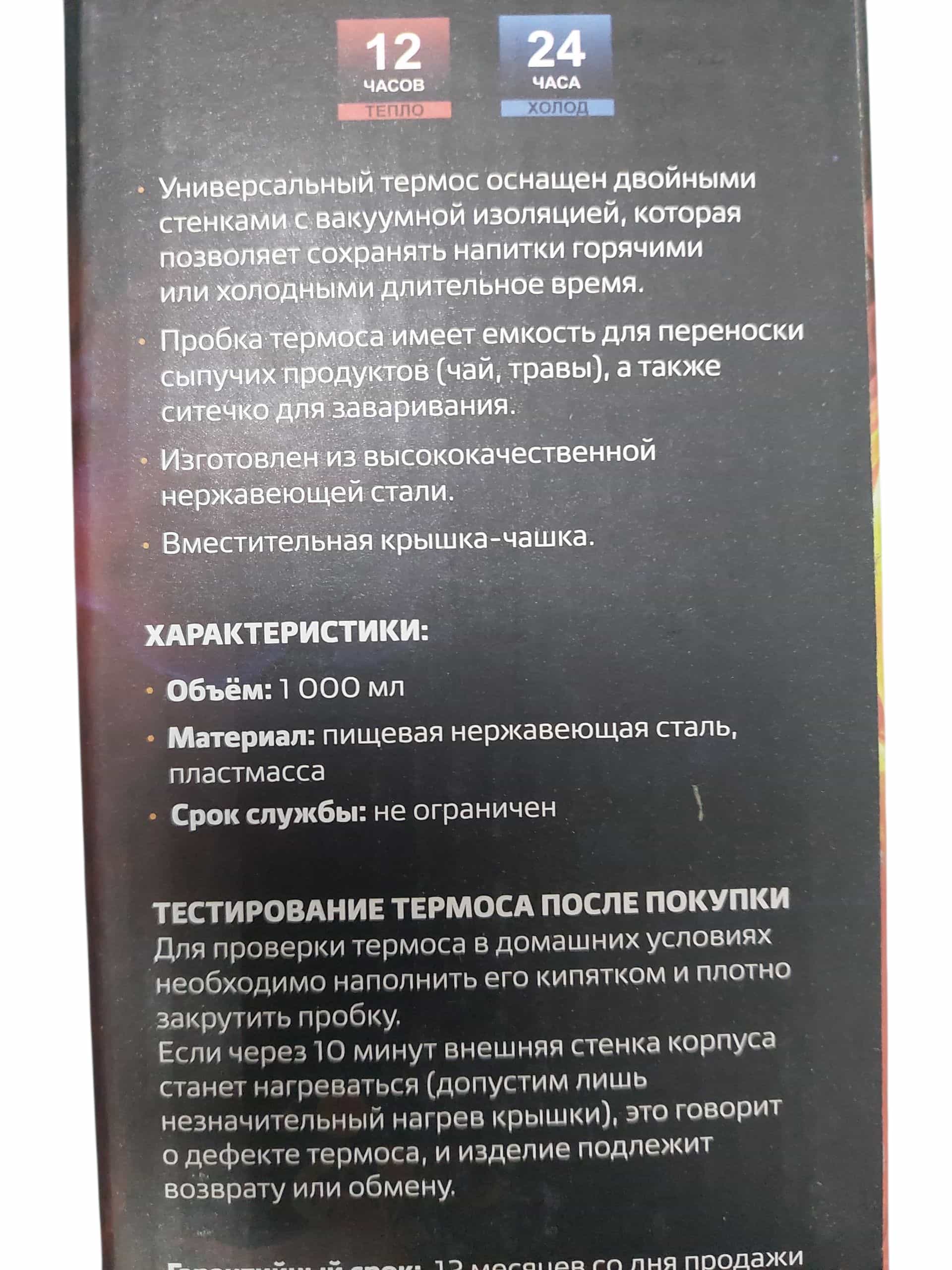 Термос снабжен надежной глухой выкручивающейся пробкой. Пробка термоса имеет емкость для переноски сыпучих продуктов (чай, травы, сахар).